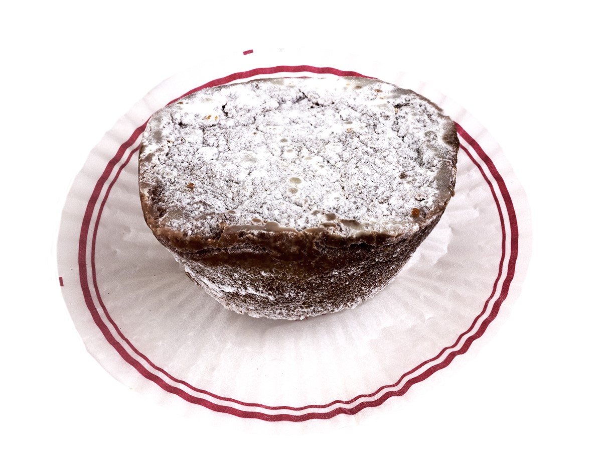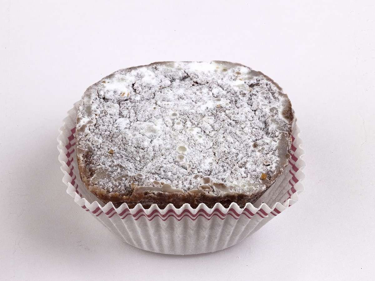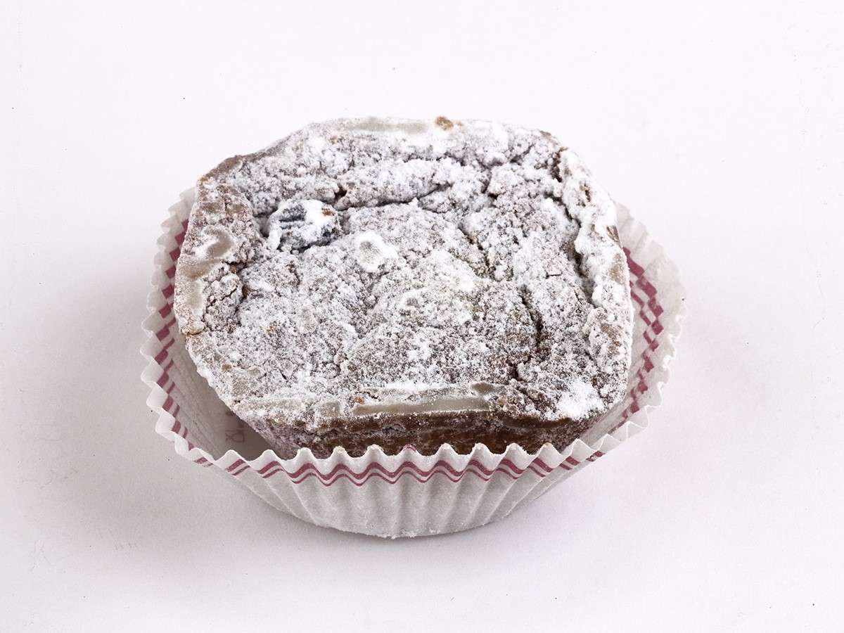 É um bolo de milho escuro, coberto por açúcar em pó e com um aroma intenso a canela e mel de cana, típico da ilha Terceira.