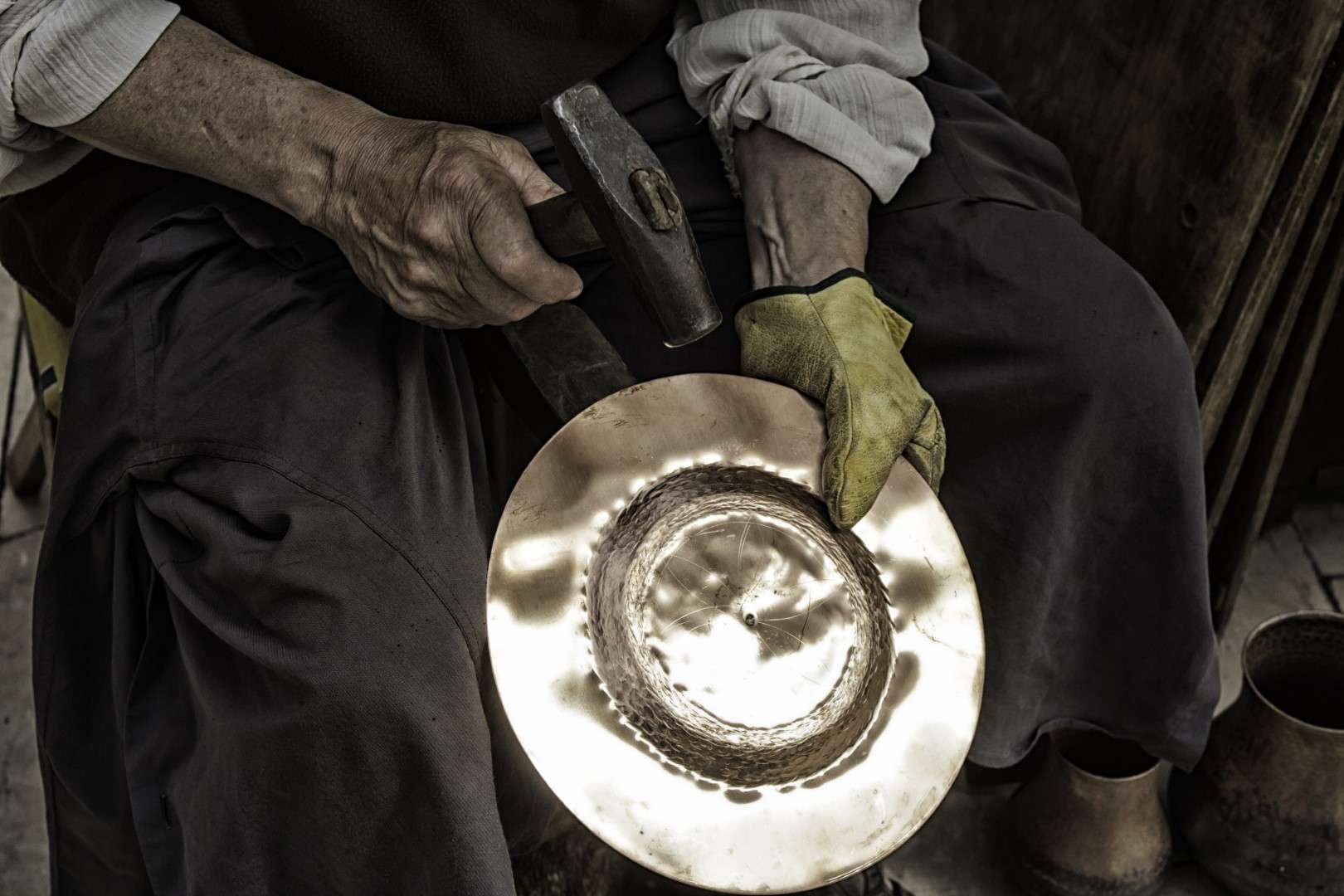 Manufatura e reparação de objetos em folha-de-flandres ou outras (ferro galvanizado, zinco, alumínio, cobre, etc.), destinados sobretudo a uso doméstico utilizando, essencialmente, ferramentas manuais, com as quais se risca, corta, e dobra a chapa, a partir de moldes previamente desenhados.