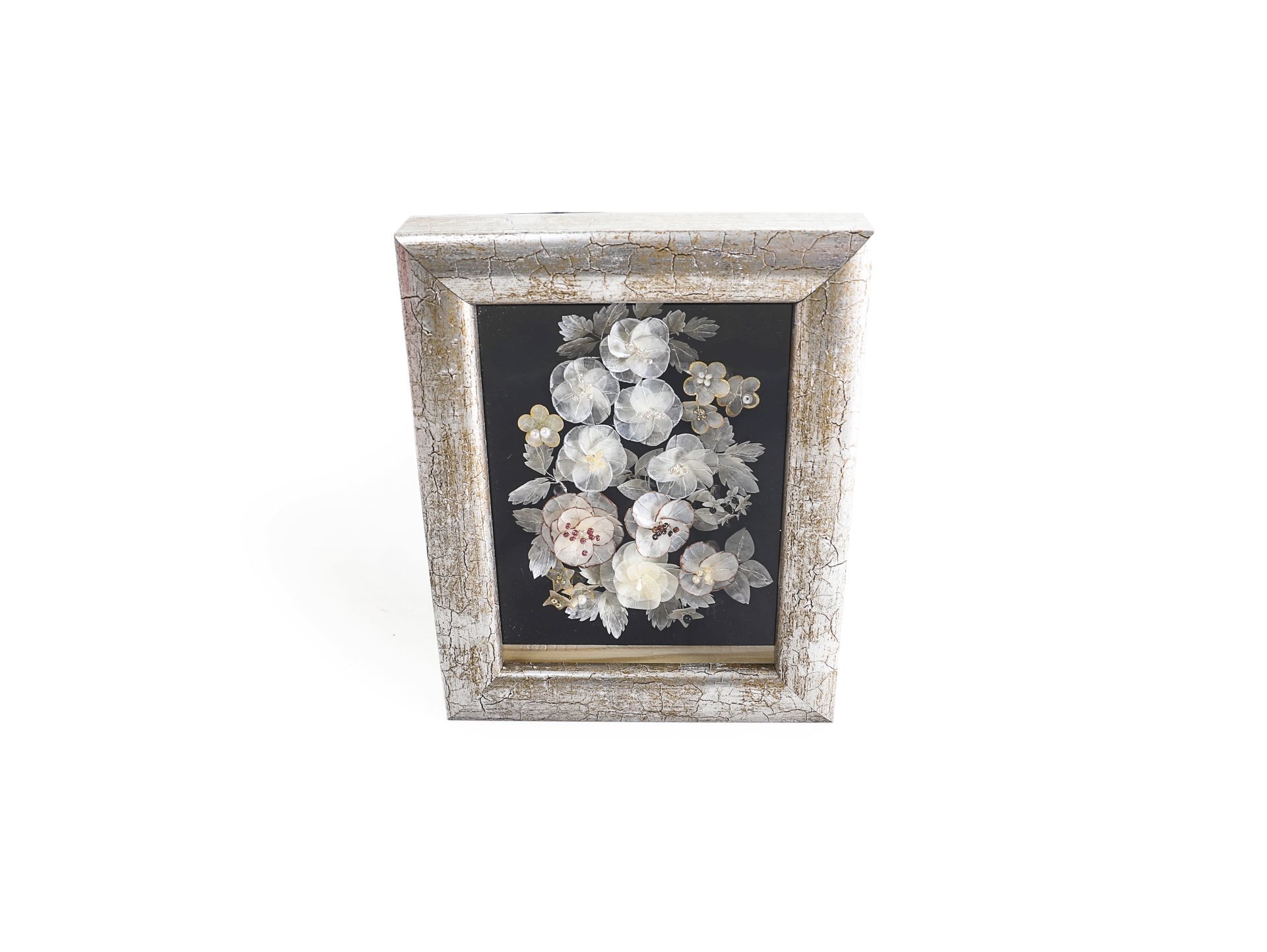 bleached scales worked with silver or gold bugle beads, on a black background,