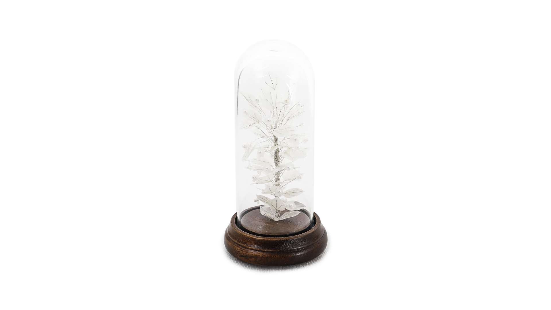Berta Paiva is a creator of fish scales works, one of the most expressive ornamental traditions of the Azorean handicrafts. From the improvement of her techniques, resulted in, among others, monochromatic vegetal compositions, from which flowers emerge that stand out for the ivory purity of their texture. The disposition of the scales, cut and arranged with silver bugle beads, result in an implosion of light, contained by traditional bell jars or by sober wooden frames.